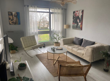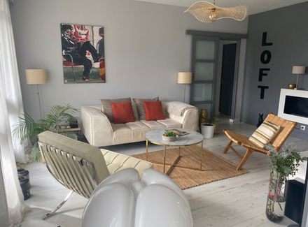 J'ai repensé cet appartement des années 70, dans un esprit ''Loft'', en ouvrant au maximum les espaces afin qu'il devienne traversant et baigné de lumière. Donnant sur des jardins privés, ce T4 de 80m2 offre maintenant une cuisine semi-ouverte, un double séjour avec cheminée à l'éthanol,